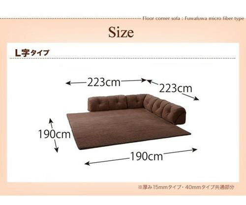 こたつに合わせるフロアコーナーソファふわふわマイクロファイバータイプ防ダニ・抗菌防臭機能付き【サイズ】■L字小:幅175 奥行175 高さ31cm、マットサイズ:142 142cm大:幅223 奥行223 高さ31cm、マットサイズ:190 190cmワイド:幅270 奥行223 高さ31cm、マットサイズ:237 190cm■コの字小:幅208 奥行175 高さ31cm、マットサイズ:142 142cm大:幅256 奥行223 高さ31cm、マットサイズ:190 190cmワイド:幅303 奥行223 高さ31cm、マットサイズ:237 190cm※40mm厚タイプのみパッド付き【梱包サイズ】■L字15mm小:1梱包(約)104 66 78 cm大:1梱包(約)104 66 78 cmワイド:1梱包(約)96 53 97 cm■L字40mm小:2梱包(約)96 53 97/100 40 48 cm大:2梱包(約)96 97 53cm/100 48 40cm ワイド:2梱包(約)96 97 53cm/100 48 40cm■コの字15mm小:2梱包(約)104 66 78cm/100 40 48 cm大:2梱包(約)104 66 78/100 40 48 cmワイド:2梱包(約)104 66 78/100 40 48 cm■コの字40mm小:2梱包(約)104 66 78/96 53 97 cm大:2梱包(約)104 66 78/96 53 97 cmワイド:2梱包(約)104 66 78/96 53 97 cm【素材】■クッション側地:ポリエステル100%中材:ウレタンフォーム、粉砕チップ■厚み15mmマット側地:ポリエステル100%中材:ウレタンフォーム、ポリエステルわた(防ダニ・抗菌防臭わた使用)■厚み40mmマット側地:ポリエステル100%中材:ウレタンフォーム■厚み40mmマットに付属のパッド側地:ポリエステル100%中材:ポリエステルわた(防ダニ・抗菌防臭わた使用)【生産国】日本(側地:中国)【注意事項】※サイズは概算です。