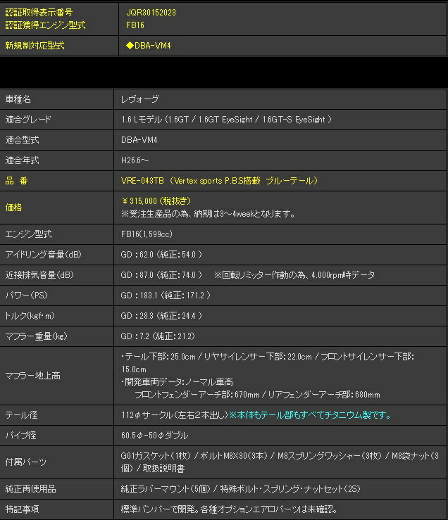 ガナドール レヴォーグ DBA-VM4 標準バンパー/DOHC/DITターボ マフラー テール部ブルー発色タイプ VRE-043TB GANADOR Vertex Sports バーテックス スポーツ