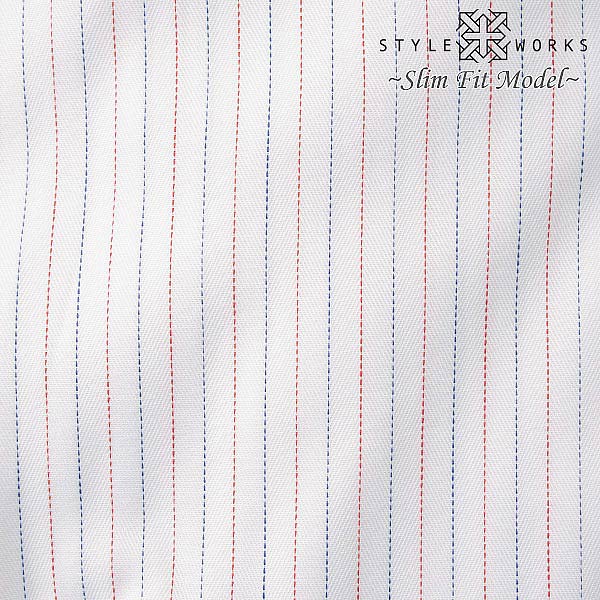 1508 国産長袖ドレスシャツ スリムフィット 綿100% カッタウェイワイドカラー トリコロールピンストライプ 白地に赤と青の細いトリコロールストライプが施されたドレスシャツ。